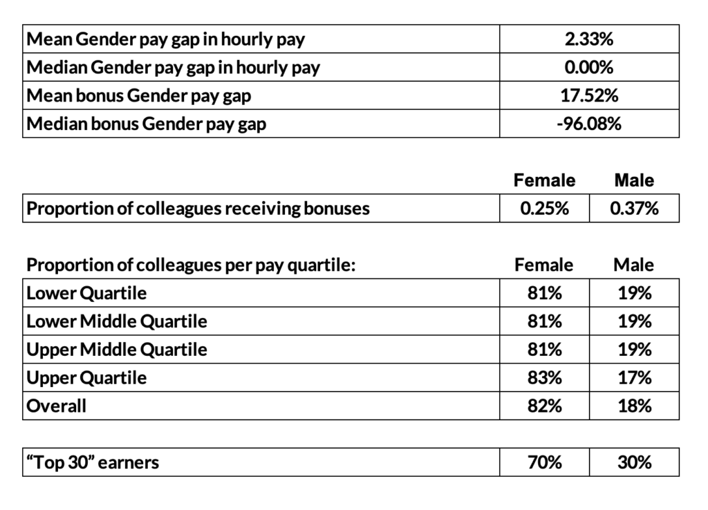 The headline numbers quoted with regard to gender pay are those for hourly pay.  The “mean” value calculates an average hourly rate for both male and female colleagues, whereas the “median” value is the mid-point pay rate for our colleagues.